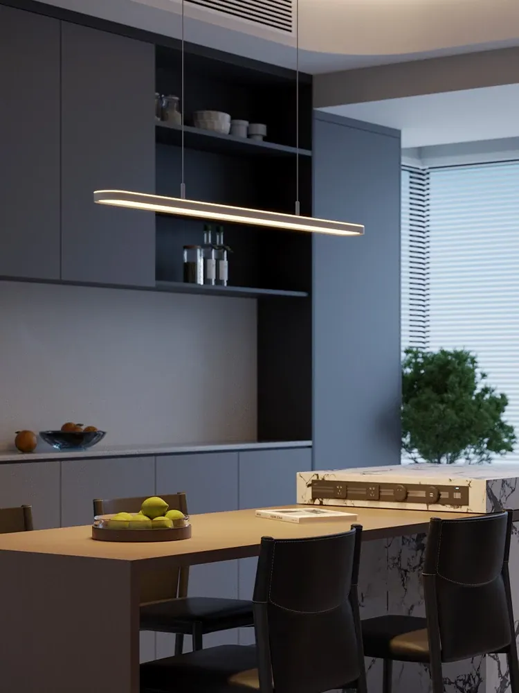イタリアンミニマルデザインのペンダントライト - 高級感あふれるダイニングバー用の一文字型ロングバーペンダント。中古の洗練されたデザインで、リビングアイランドテーブルを引き立てるインテリア照明。